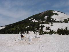 前に見えるは硫黄岳。 一回滑って登り返しです。 |