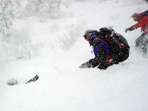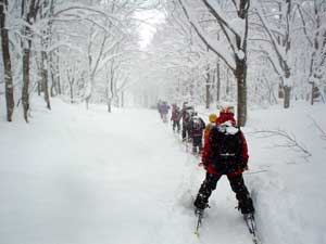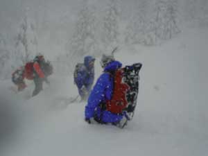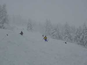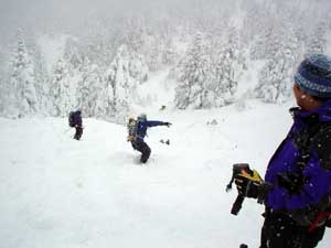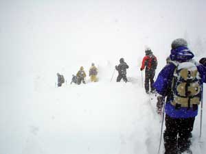 雪が余りにも多く下りもラッセルが必要なほどです。とりあえず人の滑った後とたどって行きます。 離れたら前の人が見えなくなりそうな天気です。 |