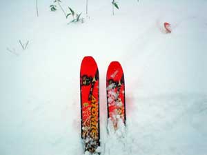 コース半ばではご覧の積雪。 板を履いて普通に立っていても膝上から腰まで埋まります。 これで転ぼうもんなら・・・ |