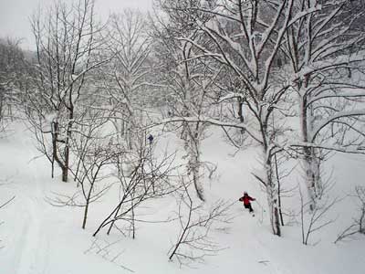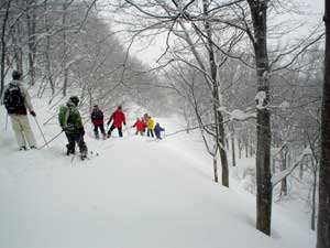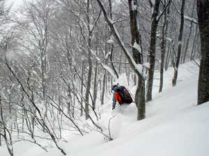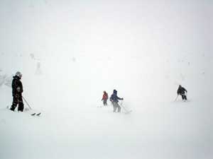 写真ではまったくわかりませんが大きな斜面です。 この日は結構な積雪後で細い板では刺さると抜けず皆さん苦労されていたようです。 されてたようですって言うのはこの日私はまたもやファットスキーで出動。 思いっきり楽させていただきました。 |