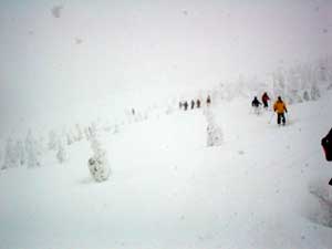 この日延々と凍った東北道を走り黒石へ到着すると城ヶ倉大橋は吹雪のため通行止めの文字が・・・ 青森周りでロープウェイへ着くと今度は強風のため運休の文字! あぁぁ・・・ 午前中に動き出し午後にツアーやることになりホッとしました。 ロープウェイ山頂駅からここ大斜面を目指して移動していきます。 |