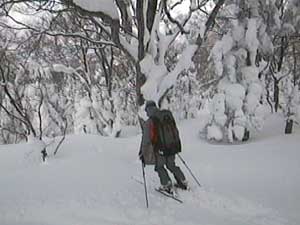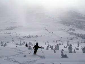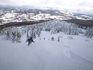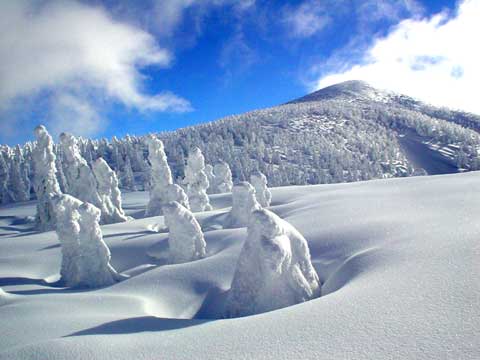 滑り出しはかわいい頭を出した樹氷原です。 樹氷の間を縫うように滑っていきます。 |