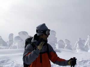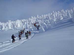 きれいな樹氷を見ながらのハイクです。 いい斜面を滑るためには歩きも必要です。 景色がいいのでぜんぜん苦になりません。 |