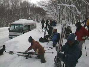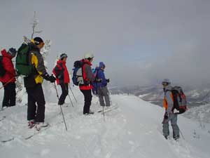 やって来ました鳴沢の大斜面。 ガイドさんの注意を聞いています。 |