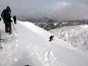 お次の斜面。 ここも長い距離楽しめる斜面です。 左側はボーダーのために残しておくよう言われましたが滑り出すと忘れてしまうんですね。 |