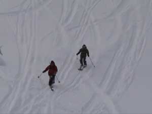 まずガイドさんが滑り皆滑り出します。 皆次々に斜面へ飛び出します。 ちなみに昨シーズンはこの斜面全体に亀裂が入っていてシーズン中ほとんど滑ることができませんでした。 (私には)久しぶりの滑降です。 |