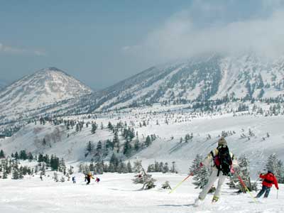 やっぱりこの天気と眺めですね。 (春の)八甲田はこうでなくっちゃ! 雪はちょっと引っ掛かりが感じられますが普通に滑れれば大丈夫です。 皆気持ち良さそうに滑っていきます。 |