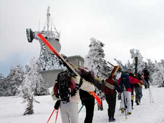 天気はイマイチっぽいですが山の向こうはわかりません。 滑り出し地点までスキーを担ぎ上げます。 |