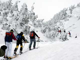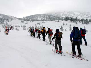 井戸岳・大岳鞍部へ向って登り始め。 ツボ足隊・スノーシュー隊・シール隊と登り方は様々です。 |