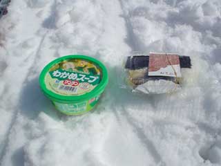 谷地温泉で用意してもらったおにぎりとスープを広げます。 こういうところで食べると最高に美味しい者です。 |