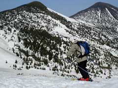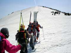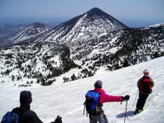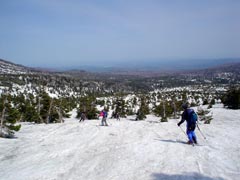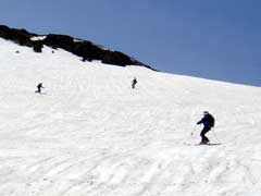 大斜面。 気持ちよ〜く滑ります。 テレマークの3人。 あれ、よくみたらガイドのTさんもテレマーク? |