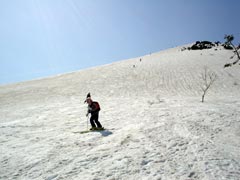 滑るのはこっち。 いい斜面です。 ここの斜面はロープウェイ使わなくても環状道路から簡単にアプローチできるので下から来る人も多いです。 |