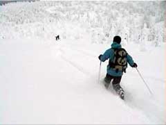 大きな斜面ですが緩くて雪が凄く深く皆さん滑らないで漕いでます。 といっても通常のスキー場では十分太い板を皆履いているはずなのですが・・・ 私はビデオカメラ片手に横をスー・・・っと・・・ こればかりは板のおかげ? |
