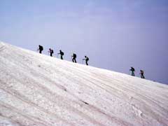 最後は危険なガス穴の横へ出てきます。 滑ってきた方向を振り向いて感慨ひとしお・・・ |