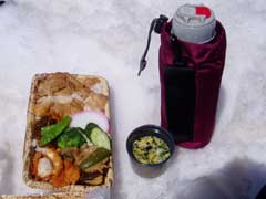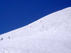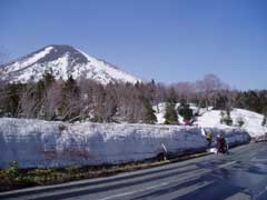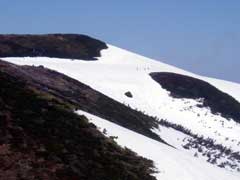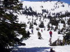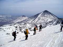 昼食中他のパーティーが大岳の別斜面を滑り降りています。 たくさんのパーティーがいても滑る斜面はいくらでもあるのが嬉しいですね。 |