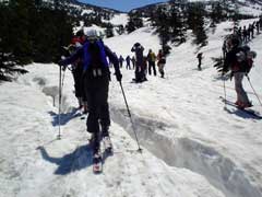 本日は何を血迷ったかテレマークでの出動です。 練習していません。 歩きは軽快です。快適です。 こんな割れ目もなんの関係もありません。 |