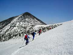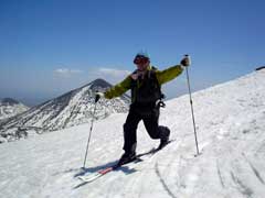 大岳滑り降りるのに四苦八苦。 小岳を少し巻いて少しでも滑る距離を増やそうとしているのでしょうか? 私には・・・不必要・・・早く下りたい・・・ |