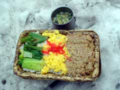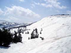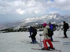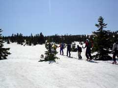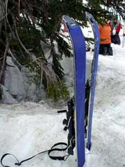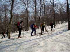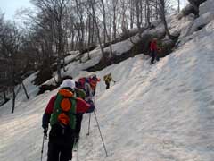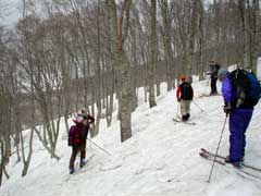 ところが林に入って滑降モードになって形勢逆転。 皆さん結構重い雪で狭いターンに手こずっていましたがこちらは小回りが効いて楽勝でした。 ただ、長い時間ノンストップは辛かったですが・・・ そういえば折角登るときに邪魔な枝を払ってたのに滑る斜面はまったく別だった・・・ |