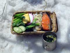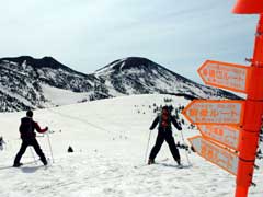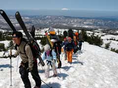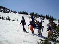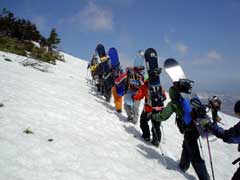大岳・井戸岳鞍部目指して登ります。 10年目で初めてフルでのツボ足です。 荷物(板)が軽いので楽勝ムード。 |