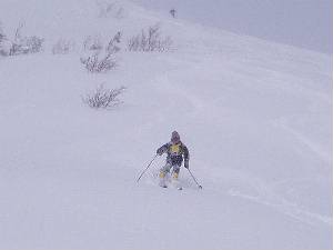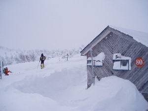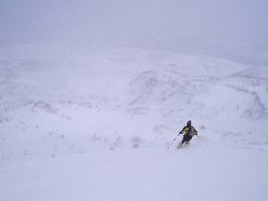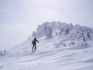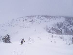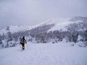 この時期雪が結構降ったというのでディープパウダーを何処で滑ろうかと思い、やってきました八幡平。 下界では青空が広がっていたのですが山へ来ると雲が多くなってきました。 リフト終点から茶臼岳を目指します。 |
