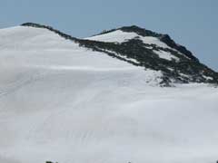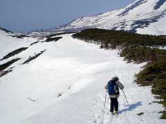 こちらに向って右側は大きな火口です。 ここは火口がいくつも集まってる場所らしく火山マニアには堪らない場所らしいです。 というわけで銅粉の湯氏のお供でやってきました。 雪付きが悪いのかシール付けたままでの薮コキがかなりありました。おかげでシールがかなりはげてしまった・・・ |