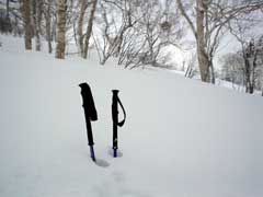 ゲレンデ脇はまだまだ新雪が残ってます。 ストックを刺してみるとこんなに埋まります! |