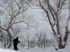 翌日宿のお手伝いをしてくれてるSさんからニセコのガイドさんを紹介してもらい比羅夫のオフピステを案内してもらいました。 山頂登頂はこの日は禁止。 でも深雪は十分楽しめました。 |
