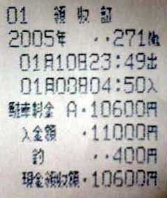 なんじゃこりゃ〜! 電話で緊急連絡先へ聞いてみてもわかりませんの1点張り。 たしかによ〜く加算条件を見てみると・・・ 最初の1日・・・1000円 それ以降30分毎に100円・・・48時間=9600円 ちなみにお金を崩そうと駆け回ってるうちに100円上がったのでした。 バカヤロー! こういった際近くのコンビには絶対両替をしてくれません。気をつけましょう。 |