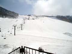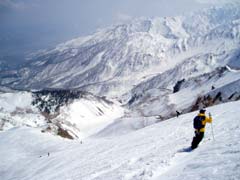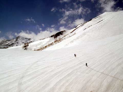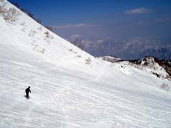 ここからスタート。 結構な標高差がありそうです。 話には聞いたけど途中休むところはないなあ・・・ 遠くに明日滑るところが見えてます・・・ |