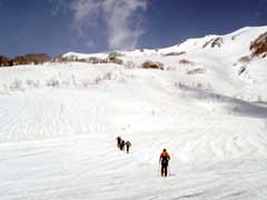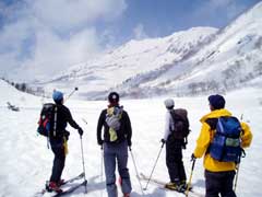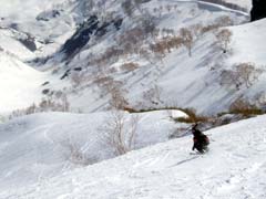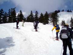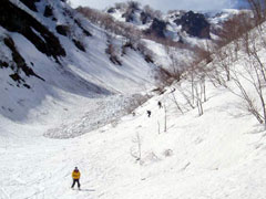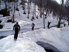 延々と林道を滑って猿倉からは除雪。 道路脇の雪の上を滑って下ります。 よく見ると結構怖いですねえ・・・ 最後は歩きで小日向の湯到着です。 |