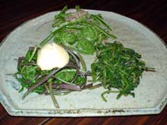 お昼志津温泉にて月山そば。 まず山菜の盛り合わせ。 これが美味。 |