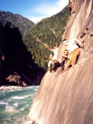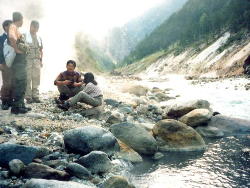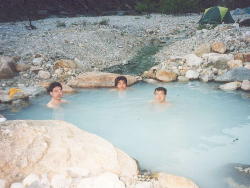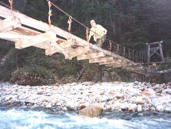 途中吊り橋を渡らなければ奥の源泉地帯と宿泊場所は行き来できませんが その吊り橋がもう崩壊寸前です。 補修しなければもう長くなさそうです。 |