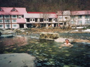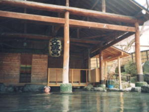 広々とした露天風呂。 左の仁王の湯は男女別。右の夕立風呂は混浴。