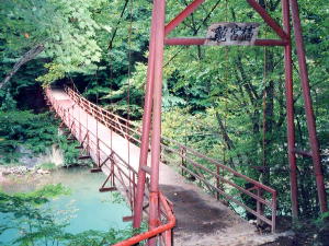 駐車場に車を停めて歩いて行く。 つり橋を渡り雰囲気よし。 露天は川沿いで開放感あり。 入浴のみは昼前後の時間に限られる。