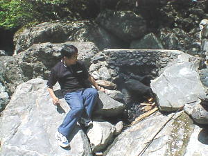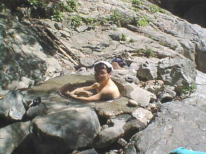 ![]() 河原になぜかある五右衛門風呂。 自分で沸かして入る。 |