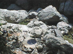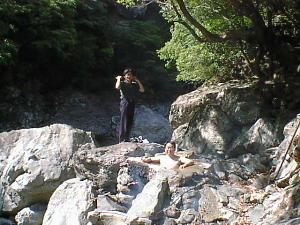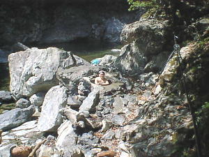 谷へ一気に下ると 河原になぜか湯船がポツンとあります。 これが五右衛門風呂です。 以前は2つあったみたいですが この時は1つのみでした。溜まっている温泉(水?)の温度は30度はありません。 ただこの日は気温が高く(28℃くらい?) このまま浸かっても気持ちよさそうです。 |